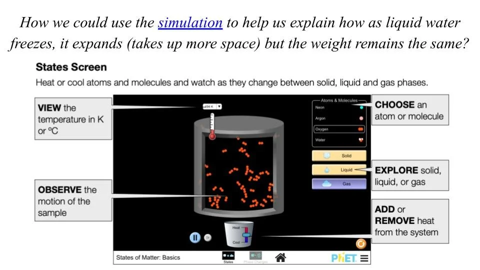 With a puzzle established — how can water molecules explain water level increasing; do they multiply? — the class uses a simulation to help them make progress. They count molecules. Some students use snap cubes to represent how the same number of molecules can rearrange to create a lattice-like structure that takes up more space than the moving liquid molecules.